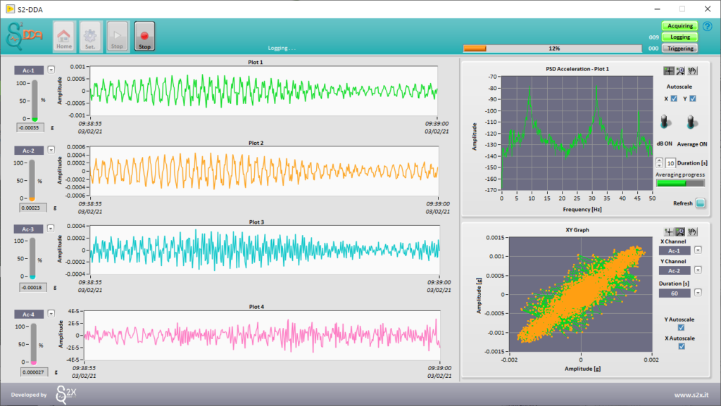 Il software è fornito a corredo di un sistema di acquisizione dati modulare in grado di interfacciarsi con sensori accelerometrici e sensori di temperatura: il sistema, pertanto, rispetta le indicazioni del Ministero delle Infrastrutture e dei Trasporti – Consiglio Superiore dei Lavori Pubblici riportate nelle “Linee Guida per la Classificazione e Gestione del Rischio, la Valutazione della Sicurezza ed il Monitoraggio dei Ponti Esistenti”. Il software S2-DDA e il sistema di acquisizione sono completamente scalabili; sono, inoltre, possibili customizzazioni per esigenze specifiche. Il software è in grado di gestire anche sistemi di acquisizione multipli configurati in architetture distribuite sincronizzazione di tipo master-slave tra i vari acquisitori, consentendo l’installazione di un gran numero di sensori anche su grandi distanze. Per semplificare le operazioni di configurazione, il software consente di creare un database di sensori e/o di salvare configurazioni precedenti, velocizzando significativamente la tediosa fase di configurazione iniziale, garantendo così un notevole risparmio di tempo. Il software permette di eseguire acquisizioni dati in continuo o a soglia, con frequenze di campionamento impostabili dall’utente da un minimo di 100 Hz a un massimo di 3200 Hz. I dati acquisiti vengono visualizzati in tempo reale, unitamente alla densità spettrale di potenza di un canale selezionato per valutare in tempo reale la qualità delle misure.